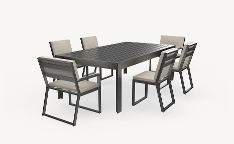 Este conjunto de comedor exterior, compuesto por una mesa rectangular y seis sillas con cojinería en tono neutro, destaca por sus líneas rectas y un diseño moderno y funcional.