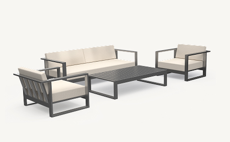 Este conjunto de living, con un sofá de tres plazas, dos sillones individuales y una mesa baja de líneas rectas, mantiene un estilo moderno y sobrio, con una clara intención de ofrecer comodidad en espacios abiertos como jardines o terrazas.